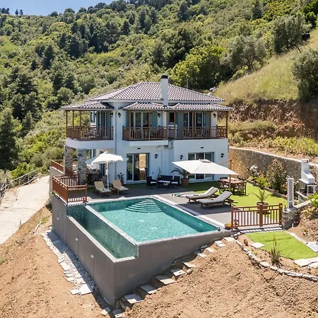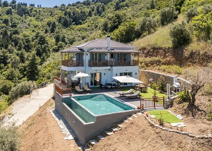 Este nevoie de în aproximativ 15 minute cu mașina până la Mamma Mia Cliff și de 10 minute de mers pe jos până în centrul orașului Glossa. Această vilă cu 3 băi se află la 65 de minute de mers cu mașina de Pefkochori, iar Perivoliou Beach este la o plimbare de aproximativ 25 de minute.
